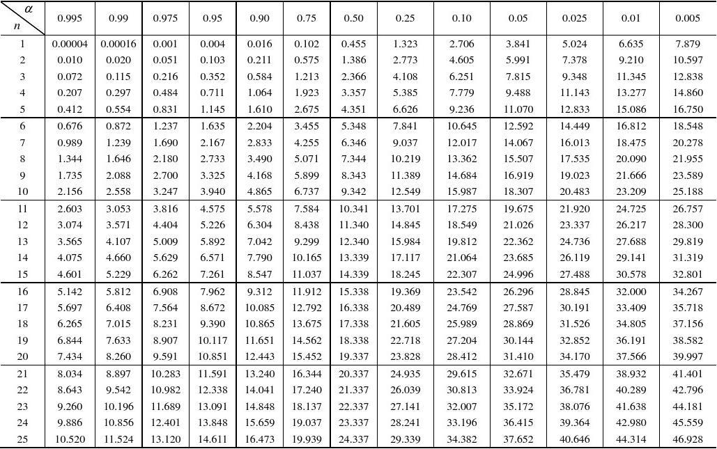 上图为卡方分布表, 为错误拒绝 假设的概率, 为自由度,即独立变量数减 1。本例中,独立变量数为 2(正面和反面),所以自由度 。